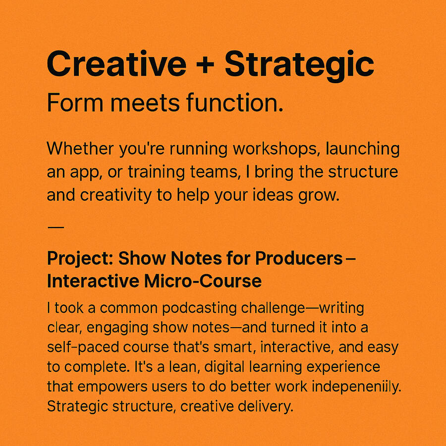 I’m Kay—a designer, strategist, and systems thinker focused on helping people learn faster, adopt change easier, and perform better.With a background in human development, educational technology, and instructional design, I help organizations of all shapes and sizes—from startups to nonprofits to service businesses—create tools, workflows, training, and learning experiences that actually work for the people using them.Whether it’s a new hire onboarding, a process that keeps falling apart, or an app that no one seems to understand, I design the clarity layer that gets people moving in the right direction.